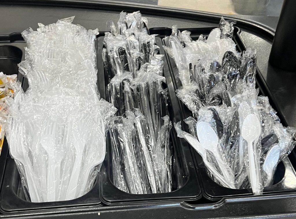 Single-use plastics are commonly used in school cafeterias to seal food and utensils.
